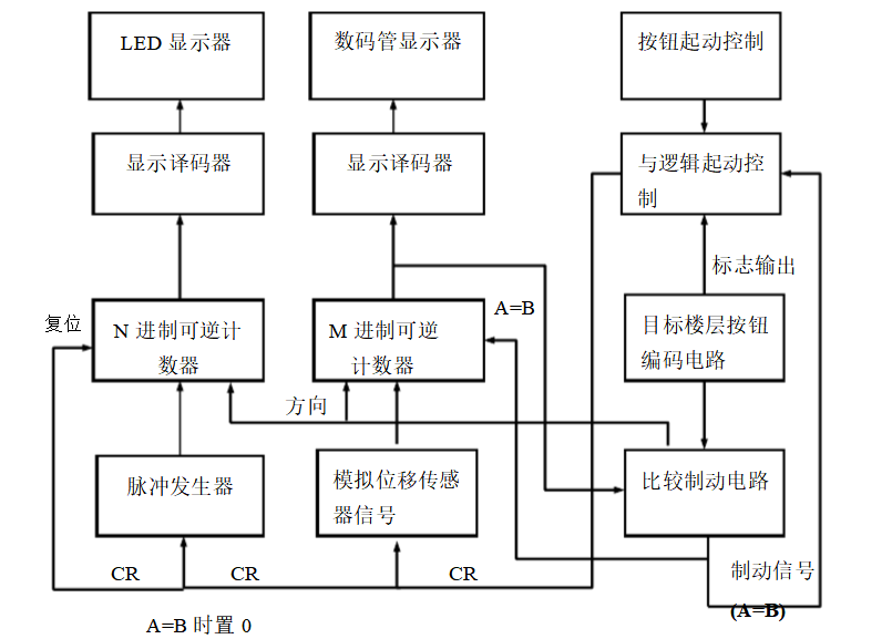 用四個(gè)LED顯示電梯行進(jìn)過程,并用數(shù)碼管顯示電梯當(dāng)前所在樓層的位置,每層電梯的入口處設(shè)有請(qǐng)求按鈕,按下按鈕,則相應(yīng)樓層的LED亮。電梯達(dá)到請(qǐng)求的樓層,該層的指示燈滅,電梯門打開;電梯自動(dòng)關(guān)門,繼續(xù)運(yùn)行。電梯運(yùn)行中,運(yùn)用比較器選擇所到樓層的先后順序。