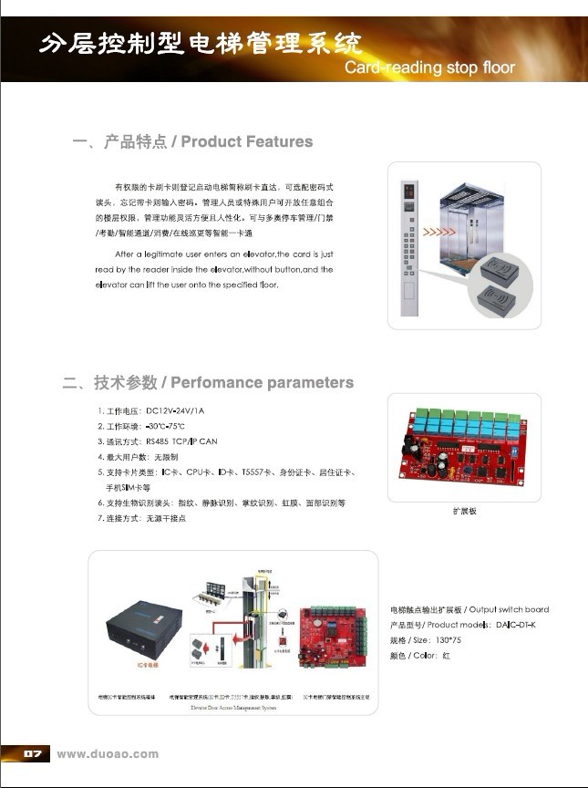 有權(quán)限的卡刷卡則登記啟動電梯簡稱刷卡直達(dá),可選配密碼式讀頭,忘記帶卡則輸入密碼。管理人員或者特殊用戶可開放任意組合的樓層權(quán)限,管理功能靈活方便且人性華智能化.可與多奧停車管理/門禁/考勤/智能通道/消費(fèi)/在線巡更等智能一卡通